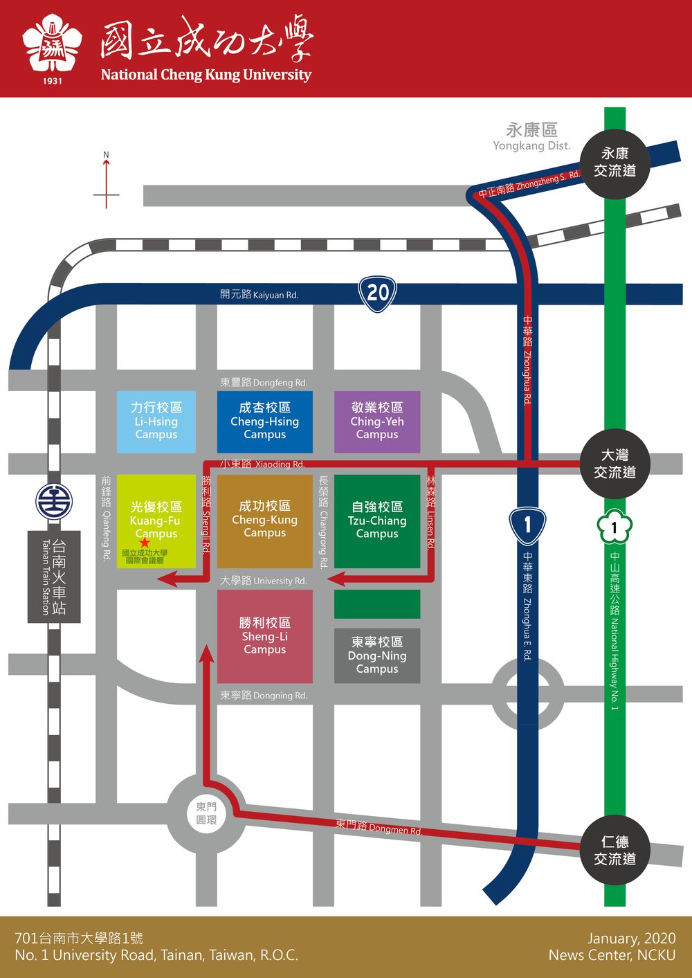 台鐵區間車前往台南火車站,約30分鐘一班車,約22~26分鐘可到達台南火車站;成功大學自台南火車站後站步行即可到達。